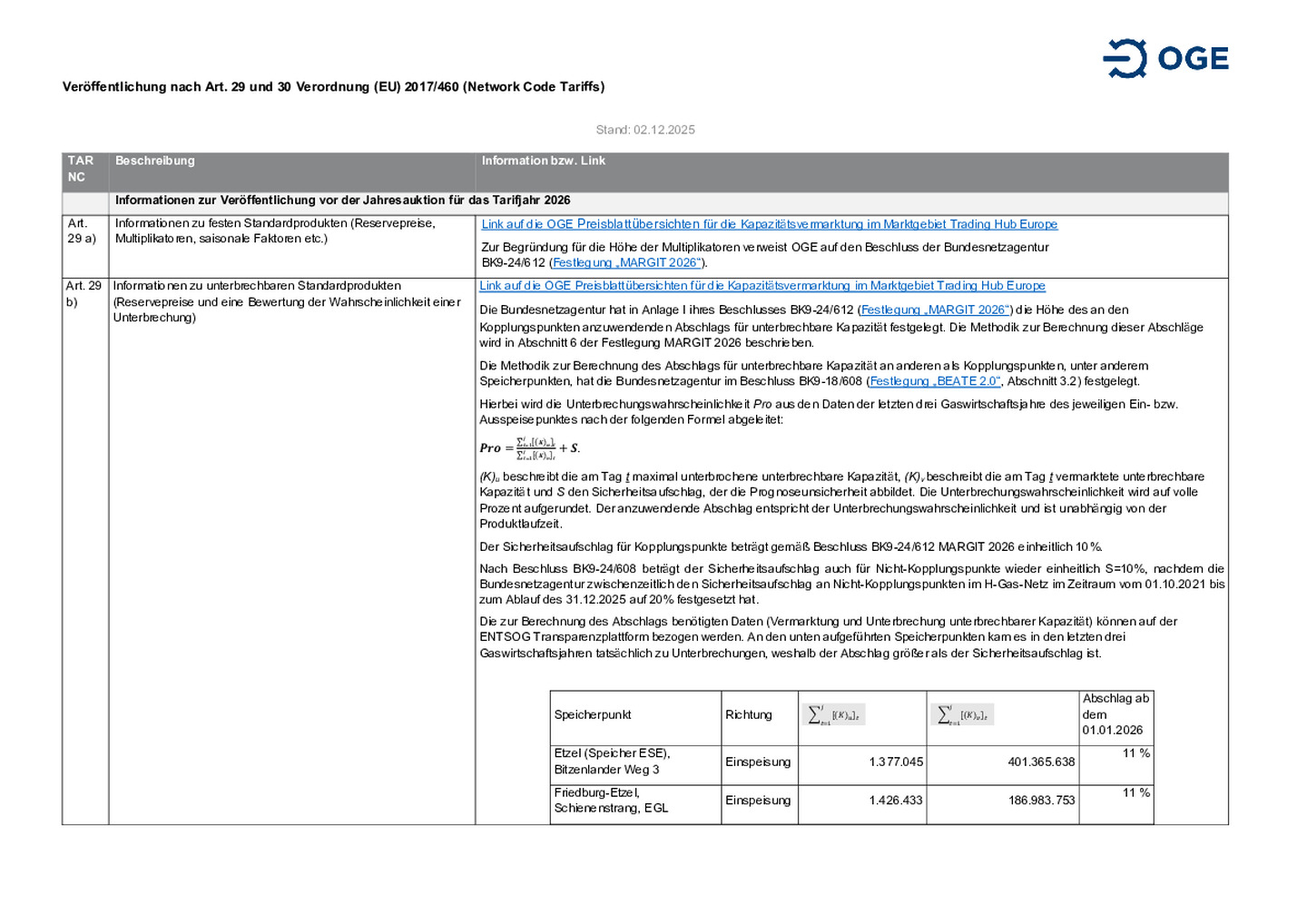 Veröffentlichung der Open Grid Europe GmbH gemäß Netzkodex über harmonisierte Fernleitungsentgeltstrukturen (Verordnung (EU) 2017/460)