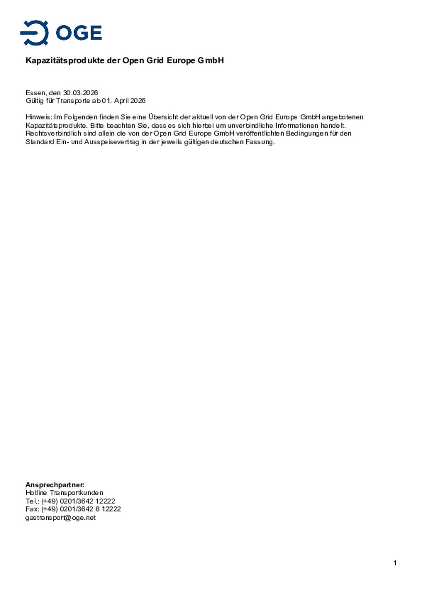 Kapazitätsprodukte der Open Grid Europe GmbH, gültig für Transporte ab 01. April 2026