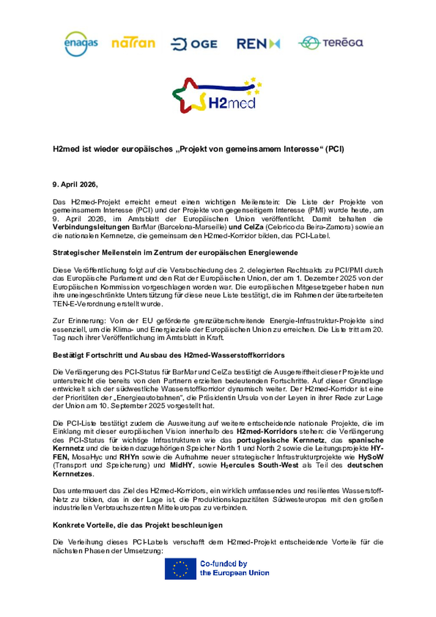 Das H2med-Projekt erreicht erneut einen wichtigen Meilenstein: Die Liste der Projekte von gemeinsamem Interesse (PCI) und der Projekte von gegenseitigem Interesse (PMI) wurde am 9. April 2026 im Amtsblatt der Europäischen Union veröffentlicht. Damit behalten die Verbindungsleitungen BarMar (Barcelona-Marseille) und CelZa (Celorico da Beira-Zamora) sowie an die nationalen Kernnetze, die gemeinsam den H2med-Korridor bilden, das PCI-Label.