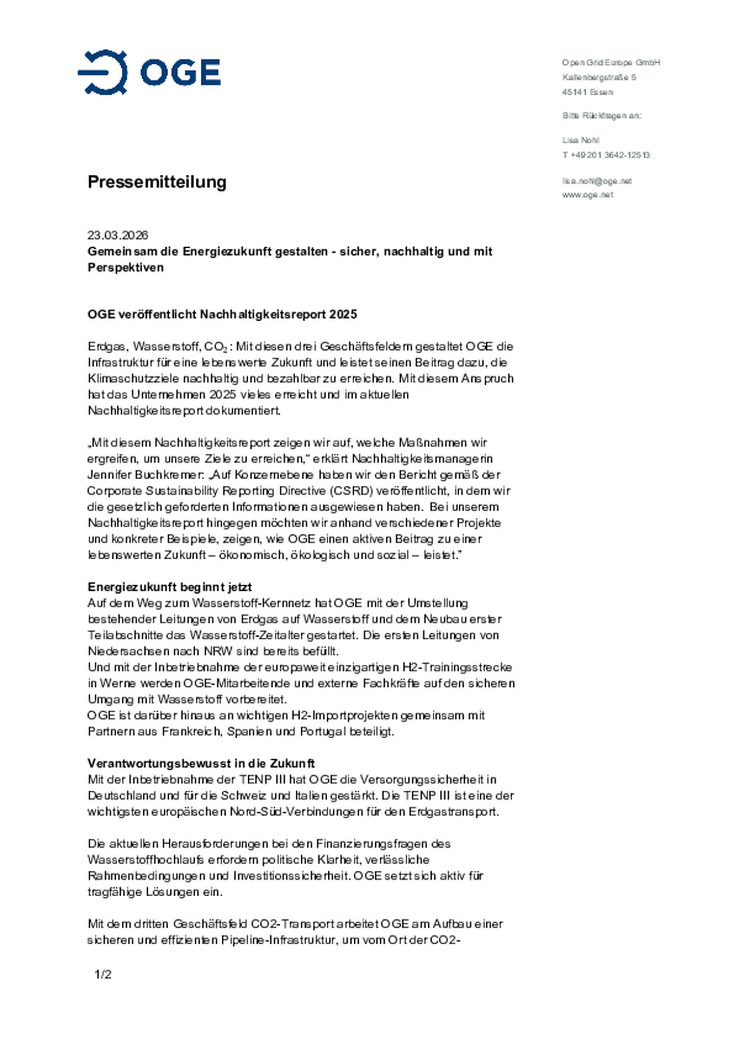 OGE veröffentlicht Nachhaltigkeitsreport 2025