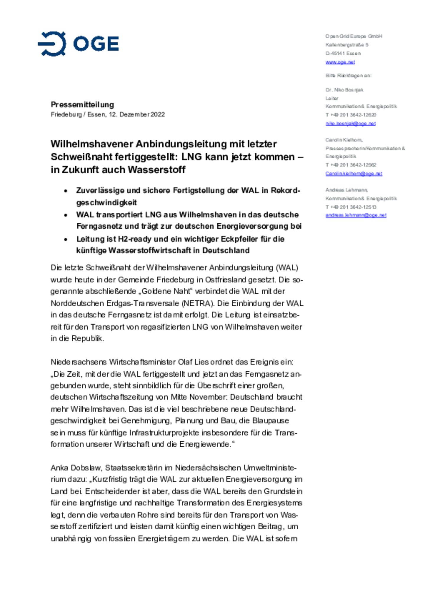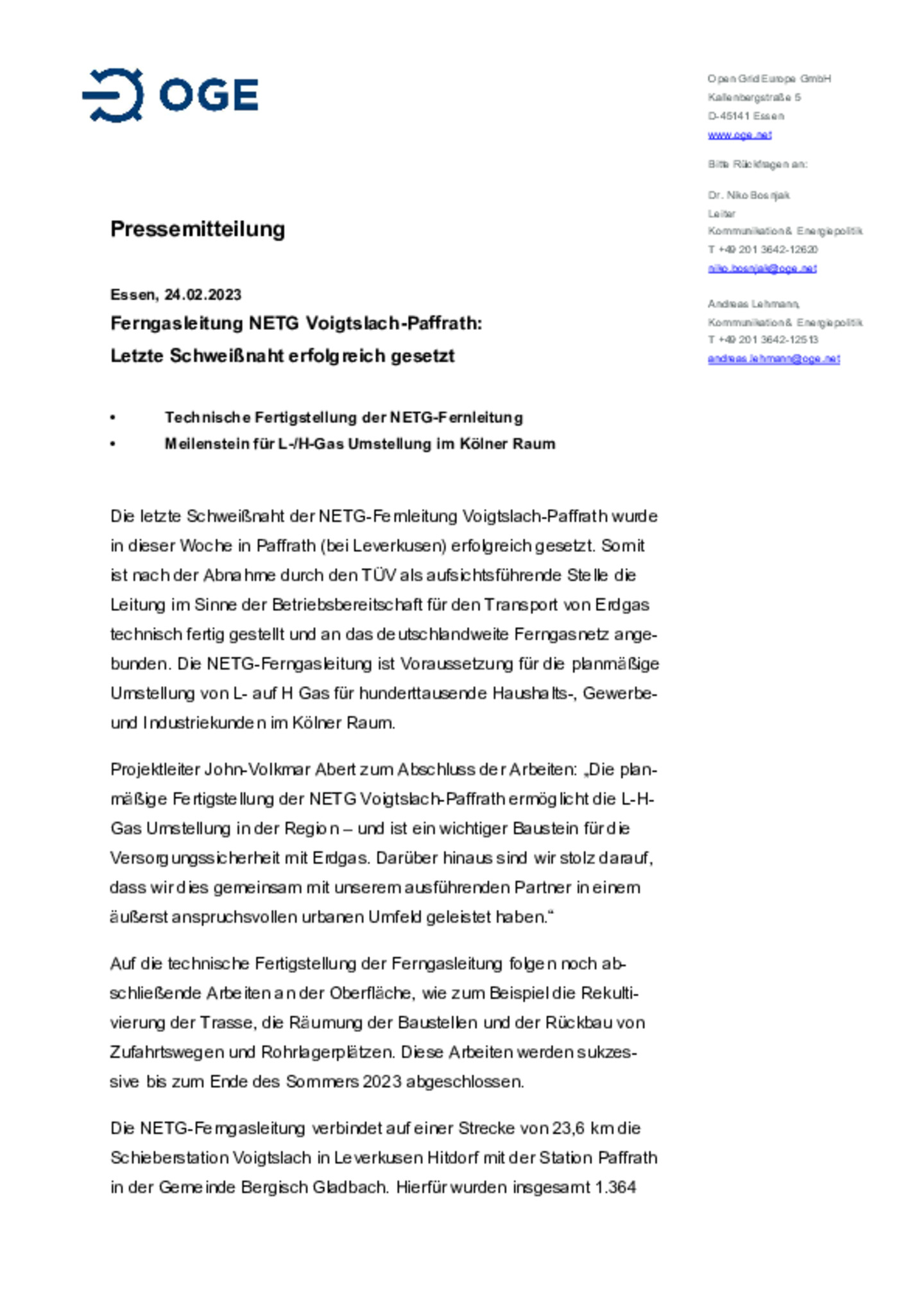 Durch den Angriffskrieg Russlands und drastische Reduzierung russischer Gaslieferungen stand die Versorgungssicherheit im Mittelpunkt. Die Transformation des OGE-Kerngeschäfts wird weiter …vorangetrieben. Die Gesellschaft muss sich stärker auf mittel- und langfristige Ziele des Klimaschutzes und der Energiewende fokussieren.