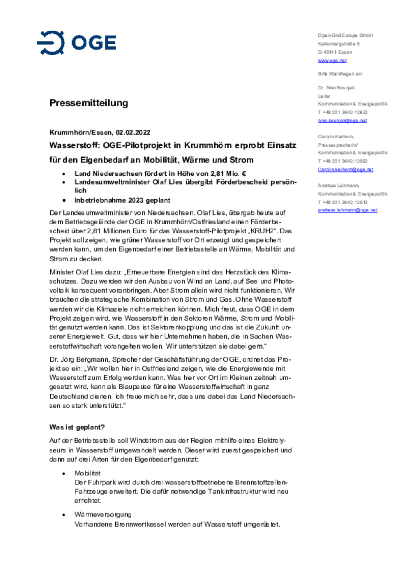 Der Landesumweltminister von Niedersachsen, Olaf Lies, übergab am 02.02.2022 auf dem Betriebsgelände der OGE in Krummhörn/Ostfriesland einen Förderbescheid über 2,81 Millionen Euro für das …Wasserstoff-Pilotprojekt „KRUH2“. Das Projekt soll zeigen, wie grüner Wasserstoff vor Ort erzeugt und gespeichert werden kann, um den Eigenbedarf einer Betriebsstelle an Wärme, Mobilität und Strom zu decken.