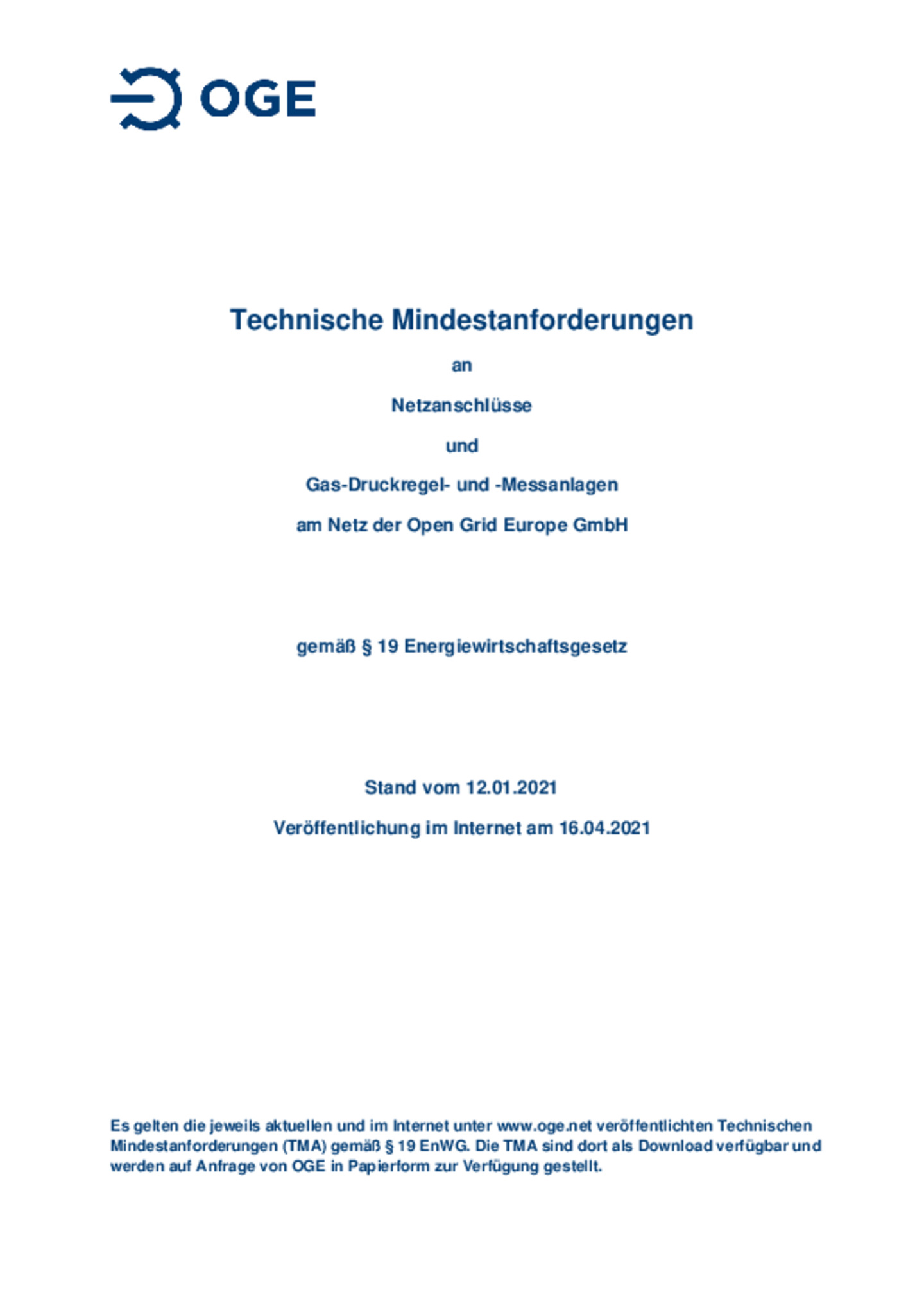 Vom 01.03.2021 bis 31.03.2021 stellte Open Grid Europe GmbH (OGE) eine überarbeitete Fassung der „Technischen Mindestanforderungen an Netzanschlüsse und Gas-Druckregel- und -Messanlagen am Netz der …Open Grid Europe GmbH“ (TMA) zur Konsultation.