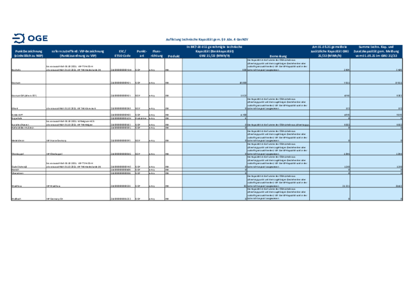 Preisblatt der Open Grid Europe GmbH für Ein- und Ausspeiseverträge sowie interne Bestellungen gem. Kooperationsvereinbarung XI im Marktgebiet NetConnect Germany GmbH & Co. KG bzw. Trading Hub Europe GmbH