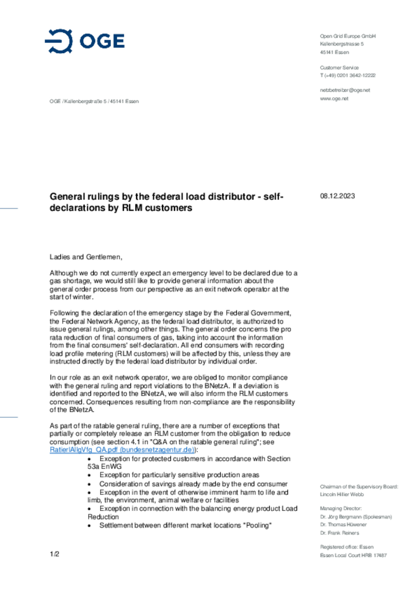 One major aspect in this context is the early provision of information on a potential risk to supply security and the establishment of communication processes between the network operators involved in the gas transportation chain, from the import points to the exit point to end users.