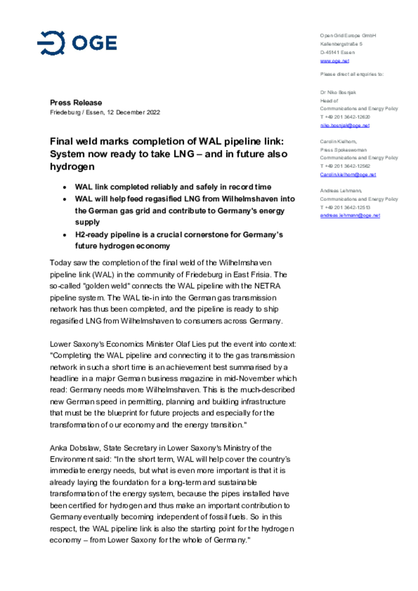 From left: Olaf Lies (Minister of Economics of Lower Saxony), Franz-Josef Kissing (Project Manager OGE), Thomas Hüwener (Member of the Management Board OGE), Morten Höegh (Shipping company Höegh), …Christian Lindner (Federal Minister of Finance), Siemtje Möller (Parliamentary State Secretary in the Federal Ministry of Defence), Niels Fenzl (Project Manager Uniper), Olaf Scholz (Federal Chancellor), Stephan Weil (Minister President of Lower Saxony), Holger Banik (Managing Director Niedersachsen Ports), Robert Habeck (Federal Minister of Economics), Christian Meyer (Minister of the Environment of Lower Saxony), Carsten Feist (Mayor of Wilhelmshaven)