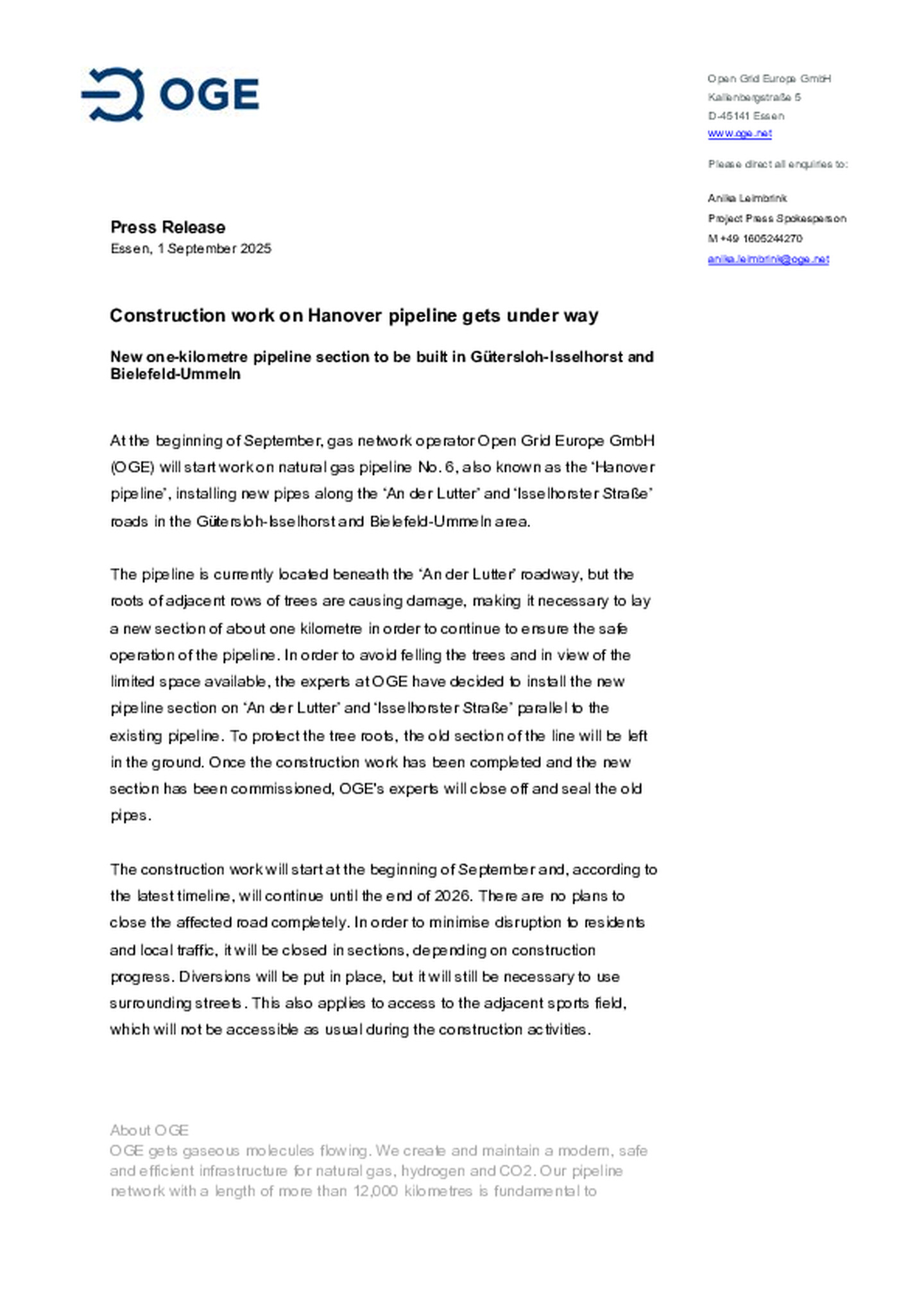 New one-kilometre pipeline section to be built in Gütersloh-Isselhorst and Bielefeld-Ummeln