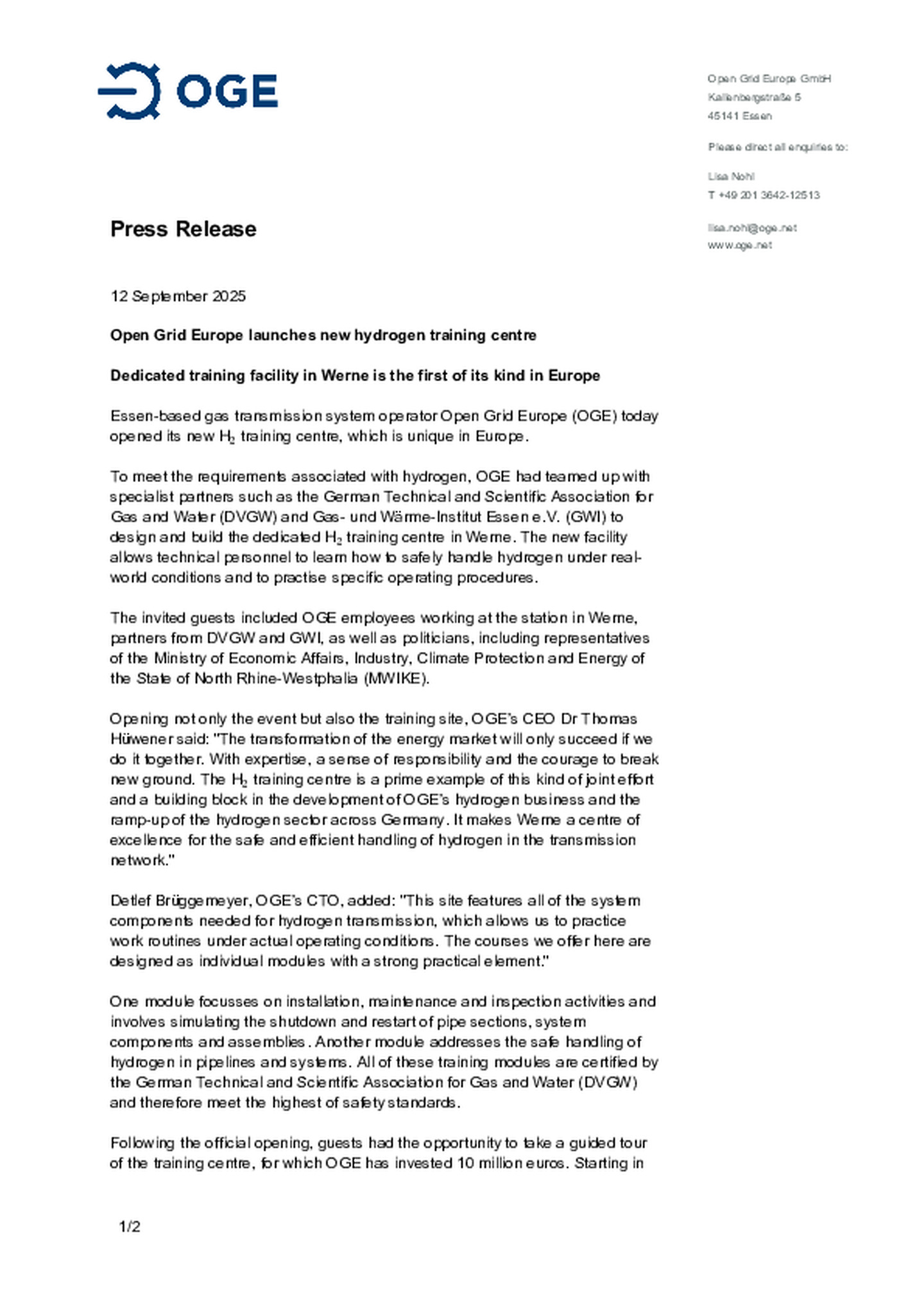 Dedicated training facility in Werne is the first of its kind in Europe. Essen-based gas transmission system operator Open Grid Europe (OGE) today opened its new H₂ training centre, which is unique in Europe.