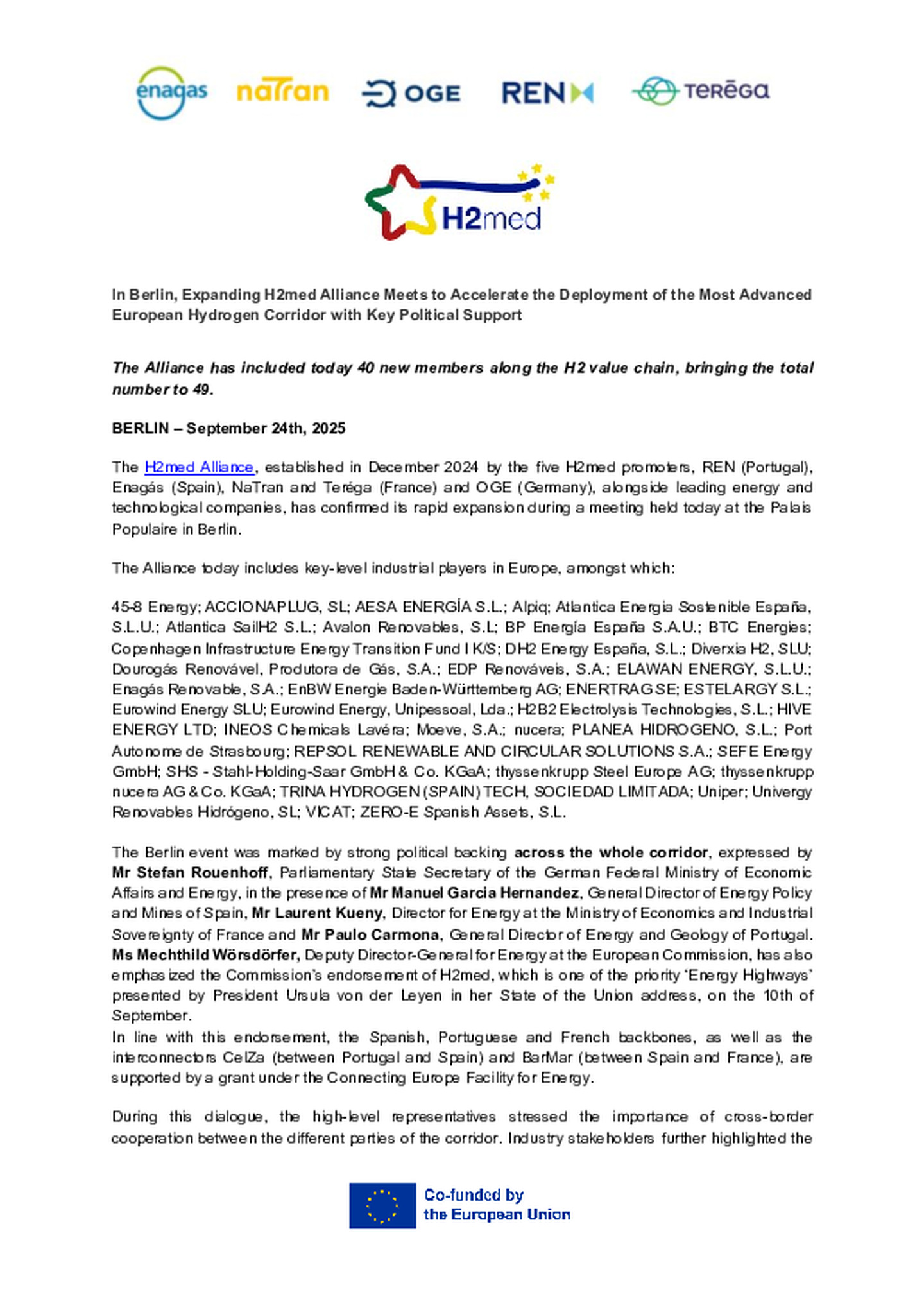 H2med Alliance Gathers in Berlin to Accelerate European Hydrogen Corridor (EN, 2025-09-24)