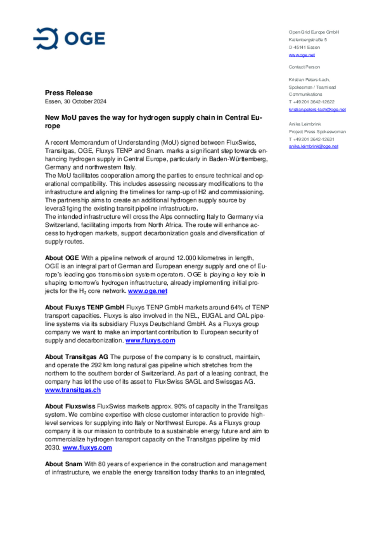 A recent Memorandum of Understanding (MoU) signed between FluxSwiss, Transitgas, OGE, Fluxys TENP and Snam. marks a significant step towards enhancing hydrogen supply in Central Europe, particularly …in Baden-Württemberg, Germany and northwestern Italy.