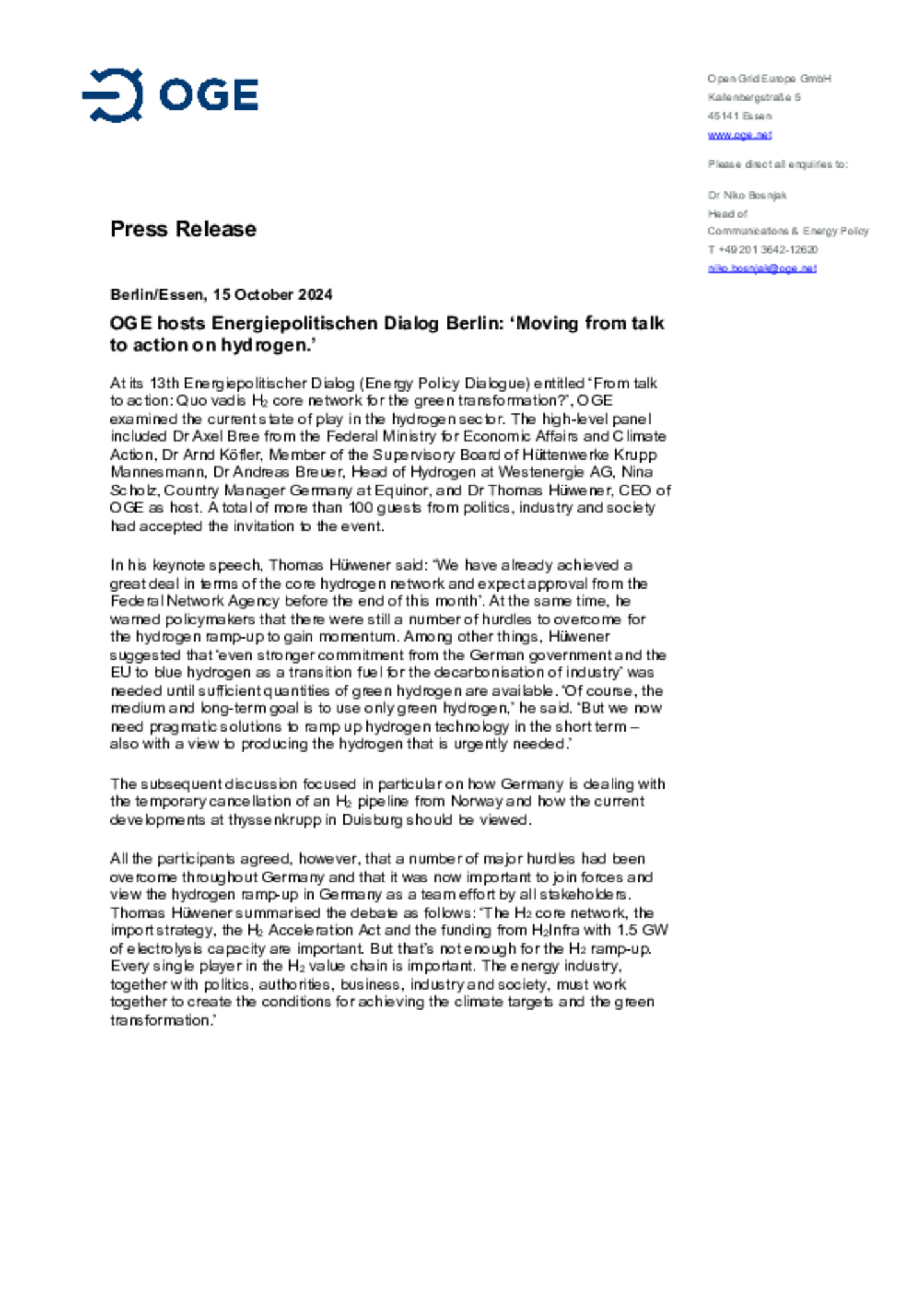 Press photo: OGE hosts Energiepolitischen Dialog Berlin: ‘Moving from talk to action on hydrogen.’