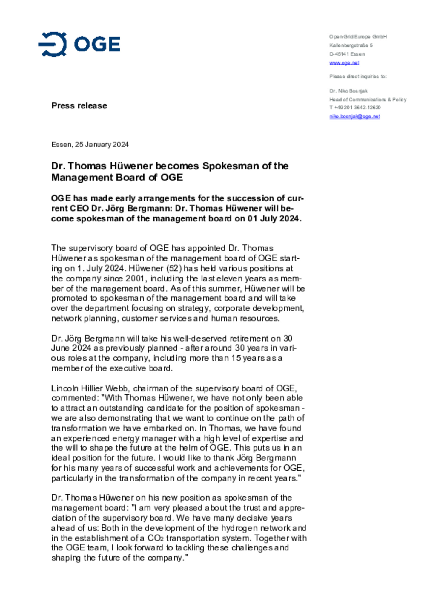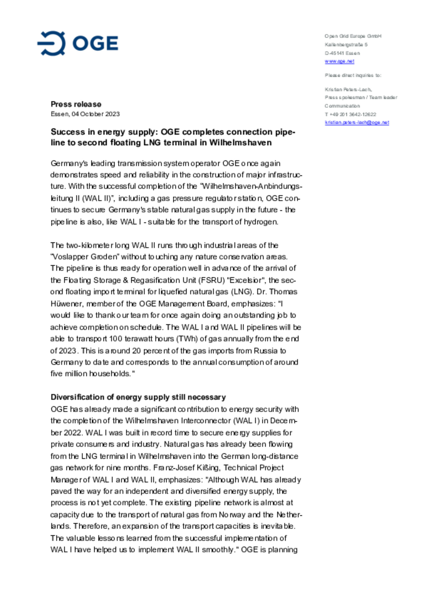 Under the motto "Pipe free for H2", the long-distance gas network operators Nowega and OGE today celebrated an important step on the way to the hydrogen age in Lower Saxony. For the first time in …Germany, the conversion of a long-distance gas pipeline to transport hydrogen was started at OGE's Emsbüren compres-sor station.