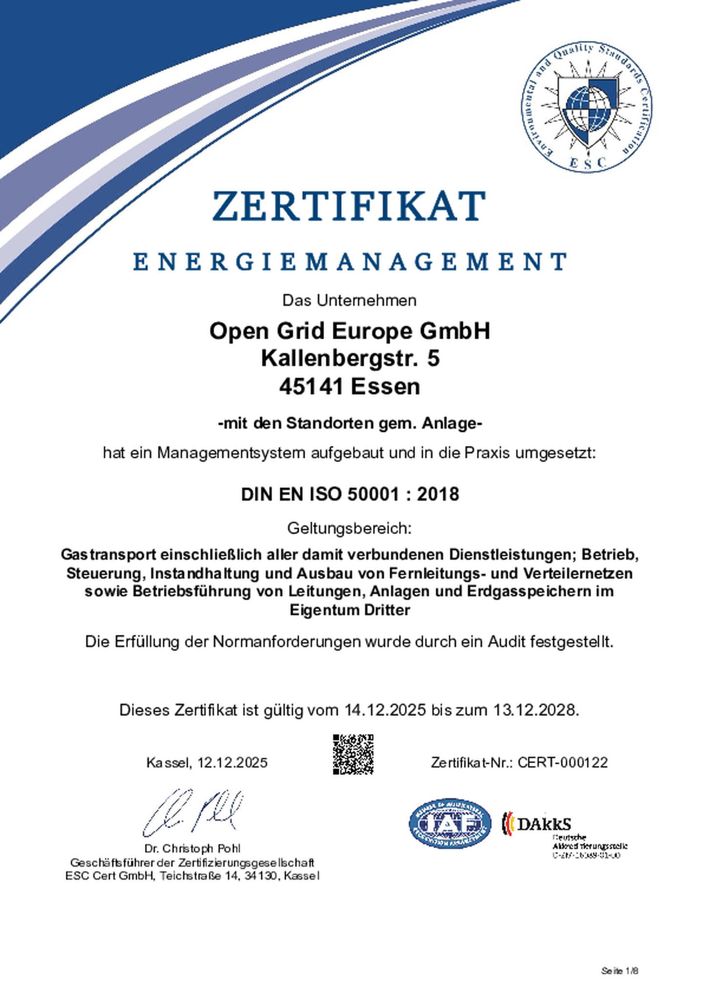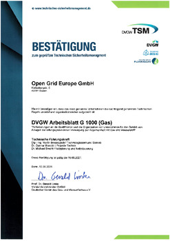 The certificates awarded to OGE confirm that our integrated QSE system meets all the requirements arising from legislation and applicable technical codes and standards, including DIN EN ISO 9001 for quality, DVGW Code of Practise G 1000 for technical safety management, the DIN ISO 45001 for health and safety, as well as DIN EN ISO 50001 for energy efficiency and DIN EN ISO 14001 for environmental matters.
